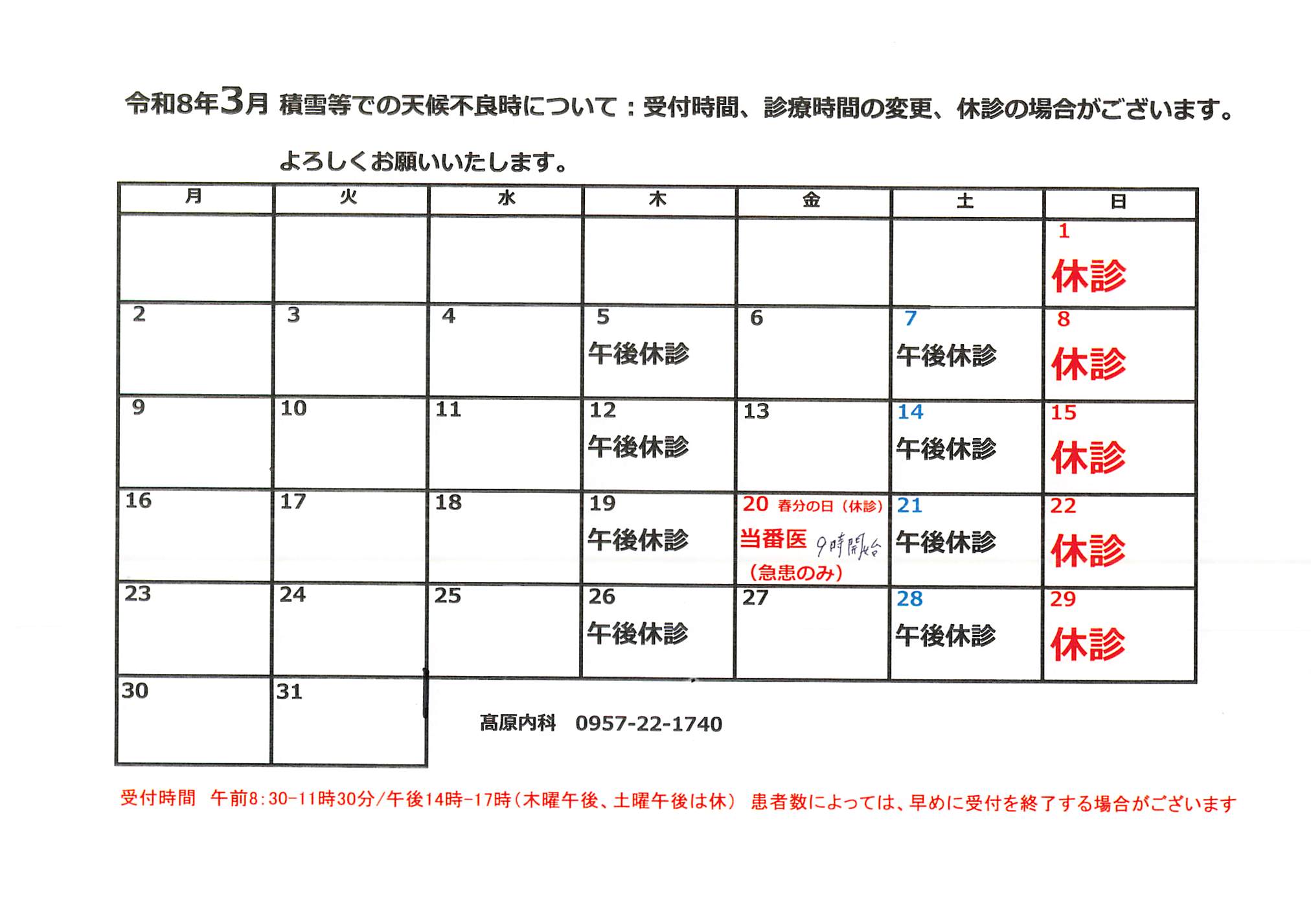 3月診療スケジュール